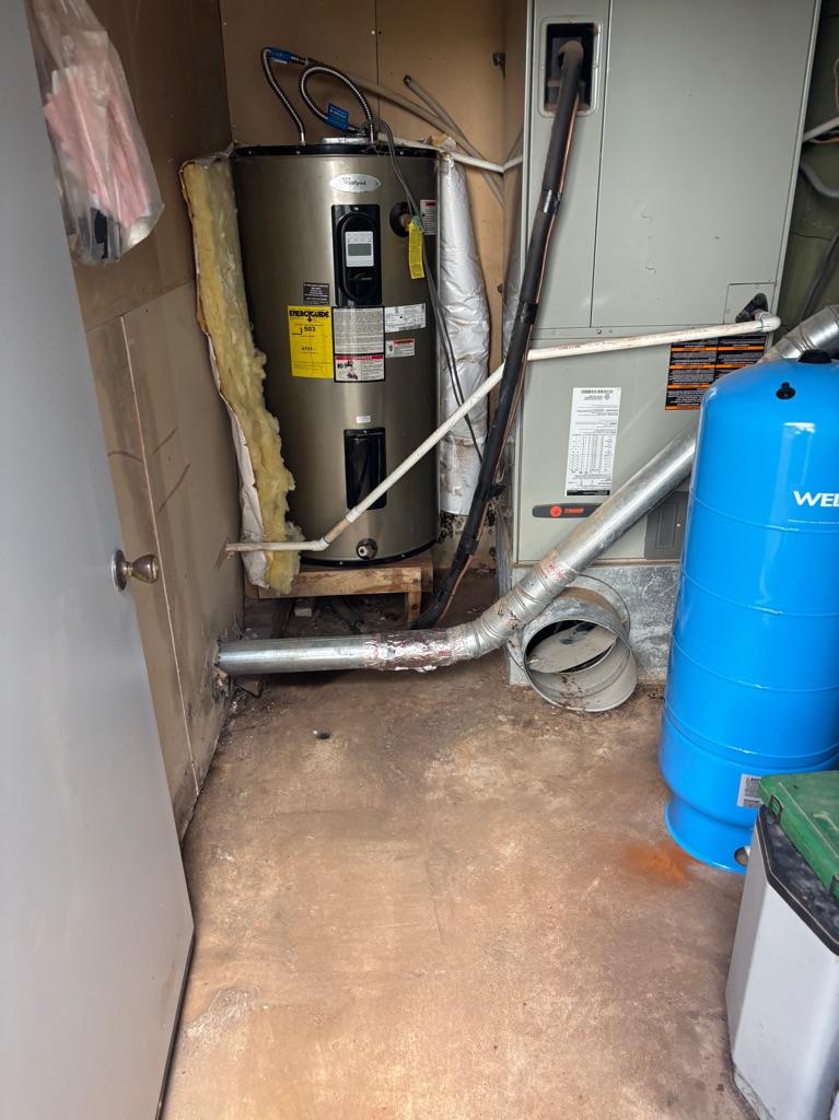 Installed 50 gallon electric water heater, adding expansion tank and pan and new flex connectors. After replacing water heater turned water back onto the house and make sure everything was working properly and there were no leaks.