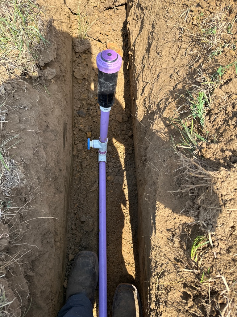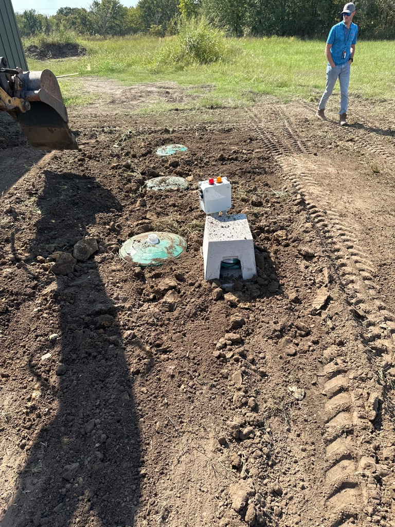 Dug hole and leveled it. Set tank and leveled it. Installed sewer line with clean out and baffle. Installed power from disconnect to control box. Installed 120’ of sprinkler line with 2 heads 30’ 360° spray with drains and pads.