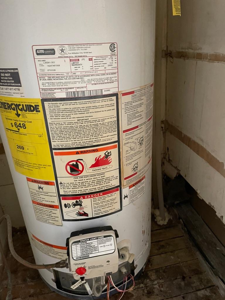 Technician installed a new 40 gallon LP water heater with necessary code upgrades and replaced all of the venting all the way through the roof, including new venting and storm collar and cap. Made new emergency drain through the floor. System is operating and leak free at this time.