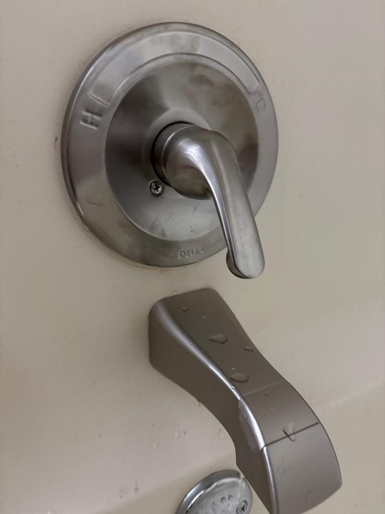 Removed and replaced existing shower trim with a new Delta brushed nickel trim kit, including the tub spout and shower arm. All components installed and tested for proper operation.